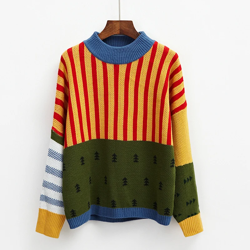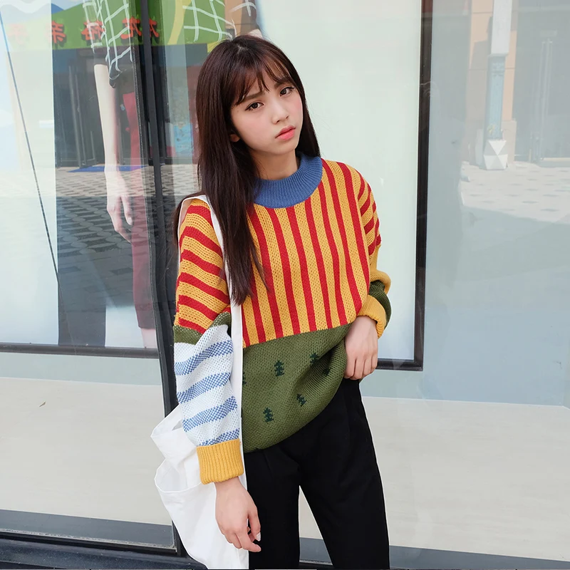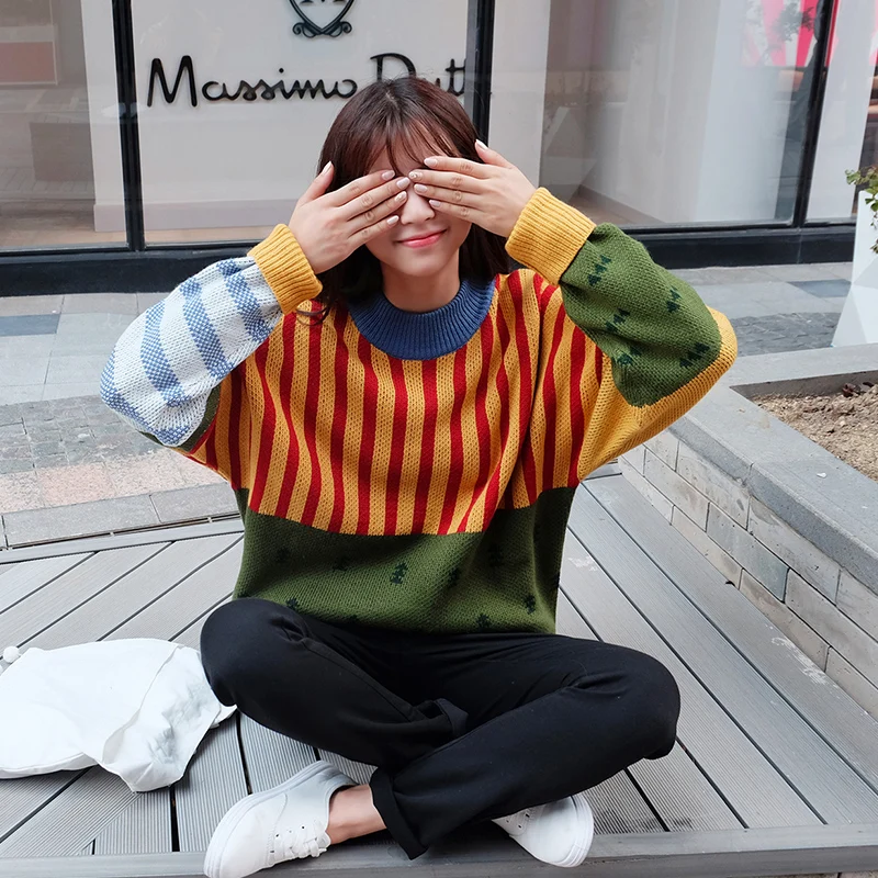 Best 2019 Korean New Winter Sweaters Woman Vintage Hit Color Stripe Loose Pullover Sweater Female Casual