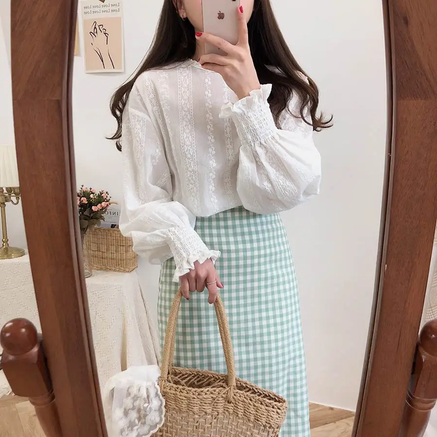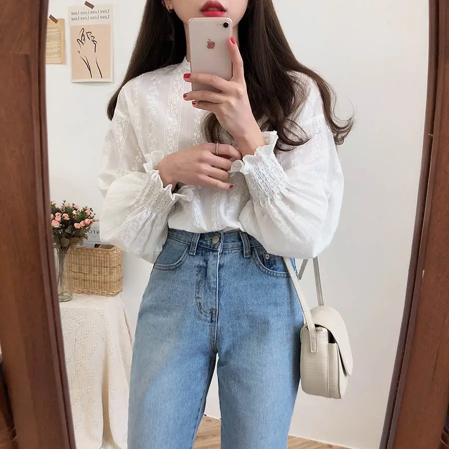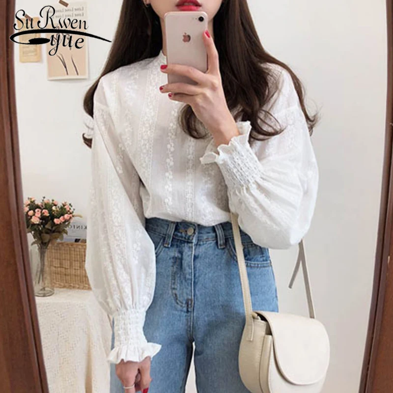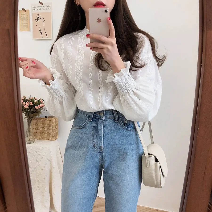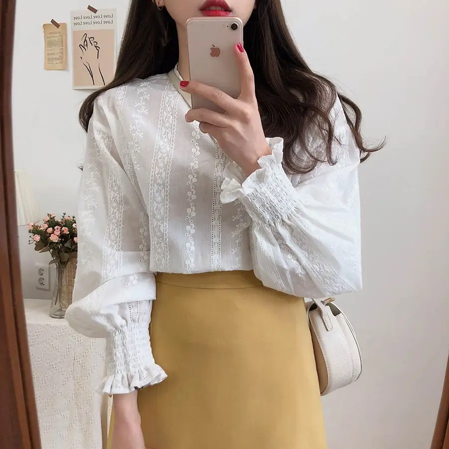 New Embroidery Lace Shirt Spring femme Casual white Tops Women Long sleeve Linen Cotton Girls Blouse Pl