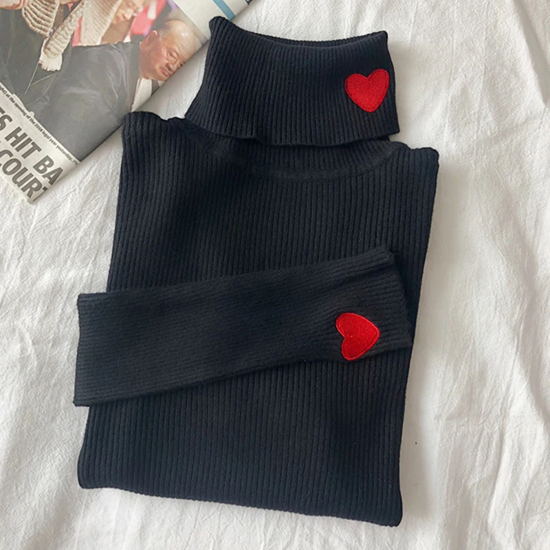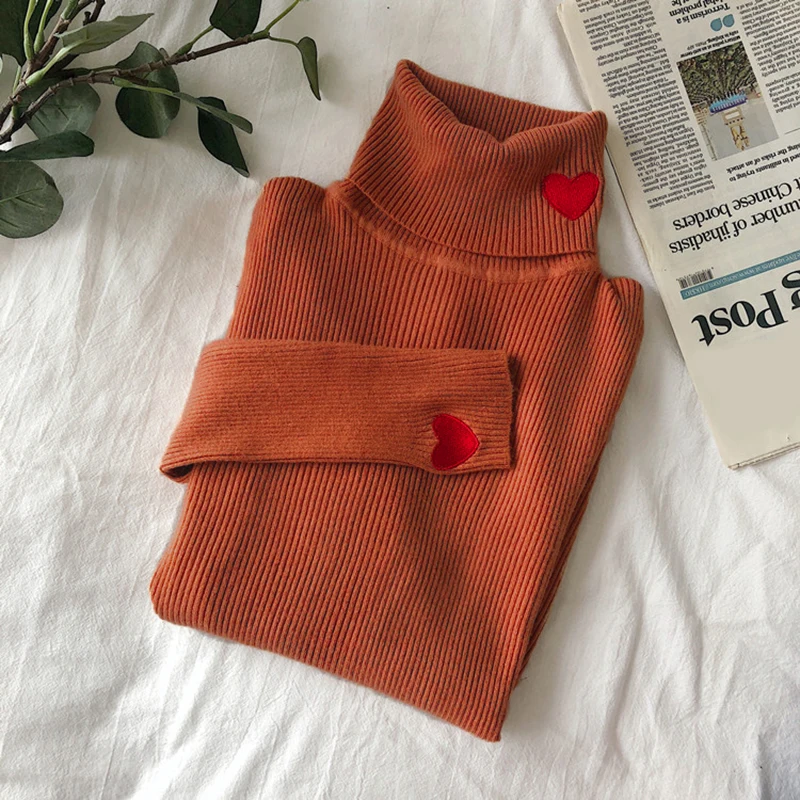 New Winter Korean Women Sweater Heart Embroidery Turtleneck Long Sleeves Sweaters Women Knitted Pullove
