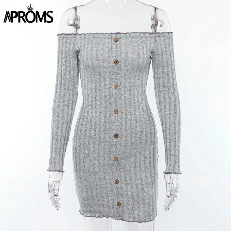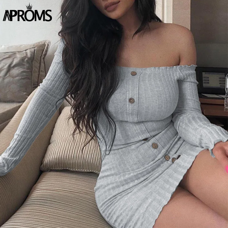 Buy Aproms Buttons Knitted Off Shoulder Tunic Dress Winter Sweater Dresses Women Sexy Long Sleeve Bodyc