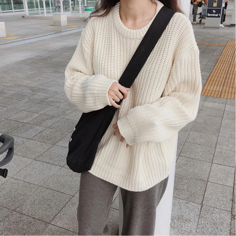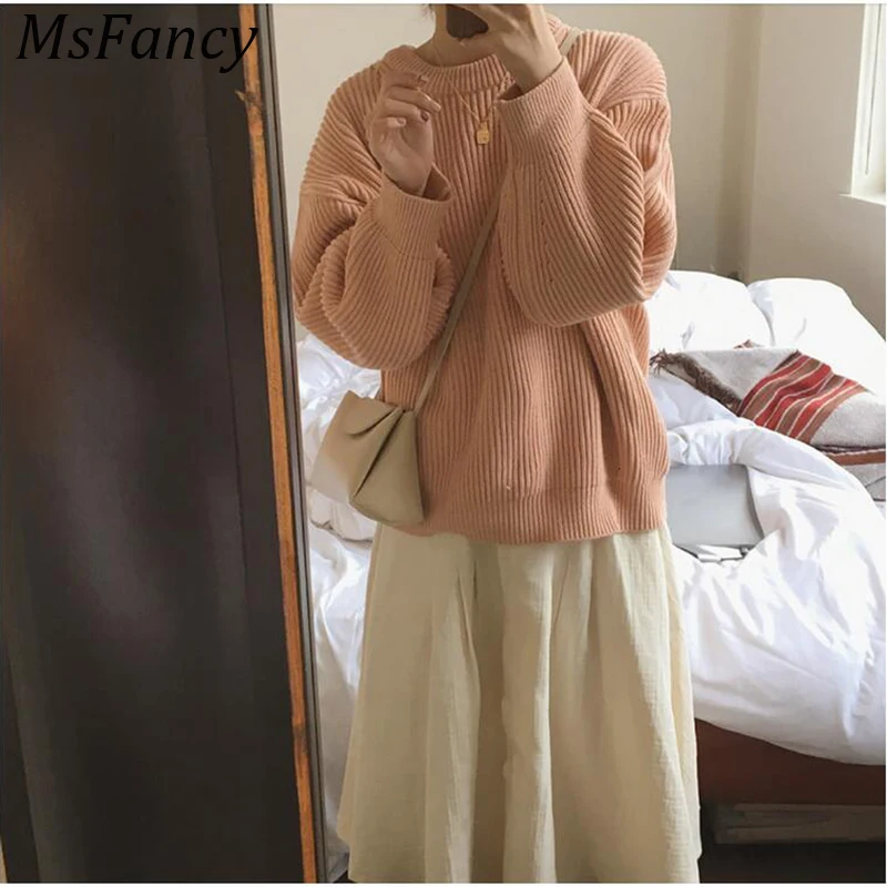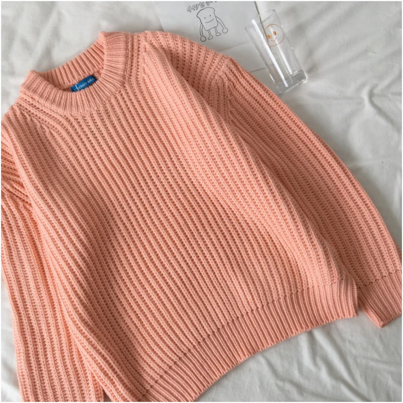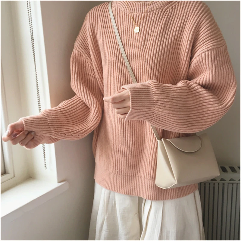 Promo Jumpers Women Salmon pink O-neck Knitted Sweater Oversized Vintage Lantern Sleeve Pullover Sweater