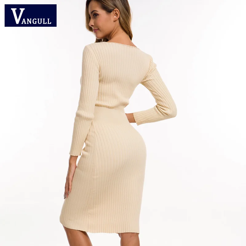 Best Vangull Autumn Knitting Cotton Dress Women Long Sleeve v-neck Sheath Mid-Calf Dress Winter Warm Sli