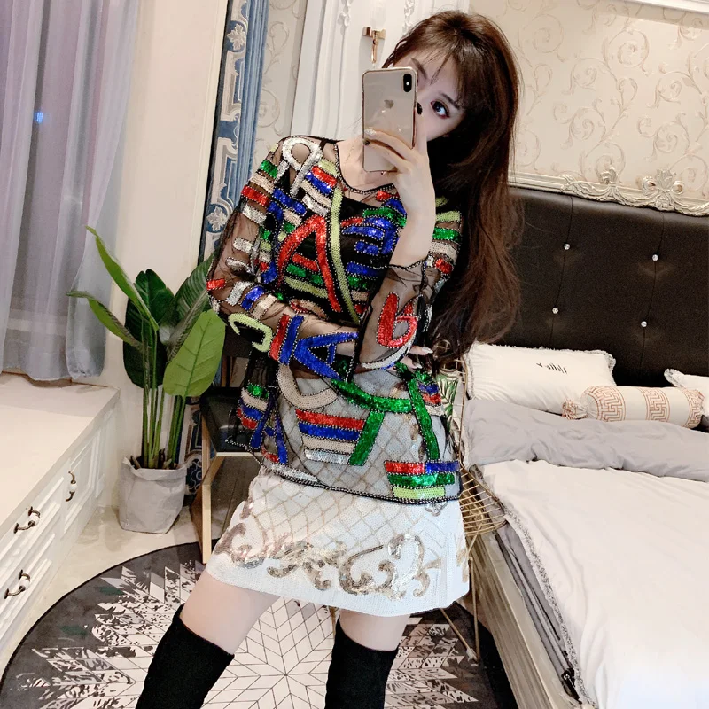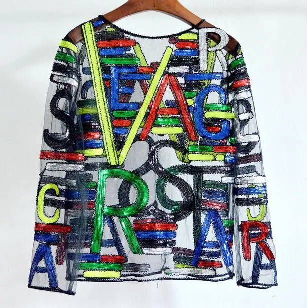 Promo Autumn Sexy Lady Long Sleeve Sequined Blouse Women Shiny Bling Bling Sequined Shirts Femlae 3D Embr