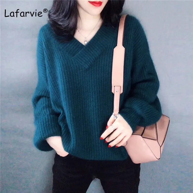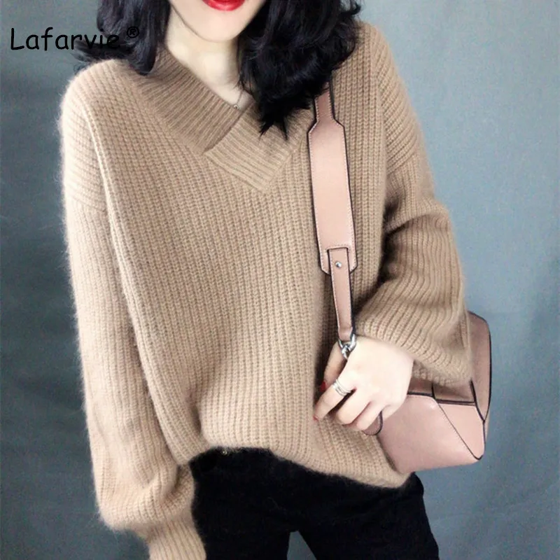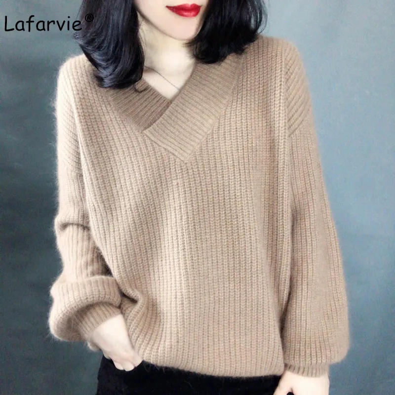 Promo Lafarvie High Quality Cashmere Blended Knitted Sweater Women Tops Autumn Winter V-neck Pullover Fem